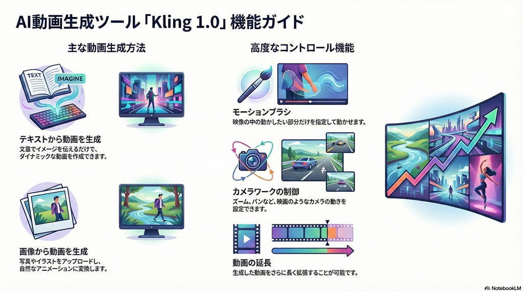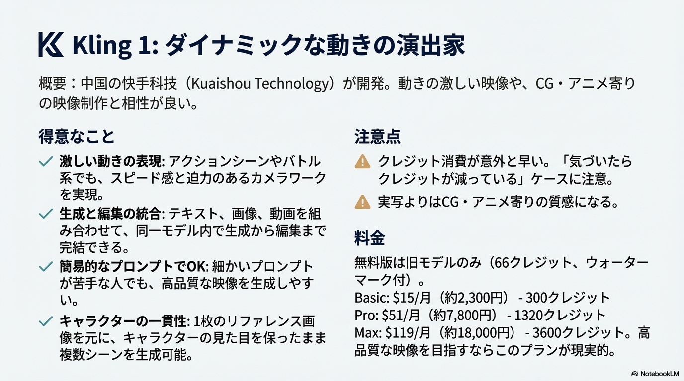 検索結果によると、Kling 1.0 は以下の特徴を持ちます