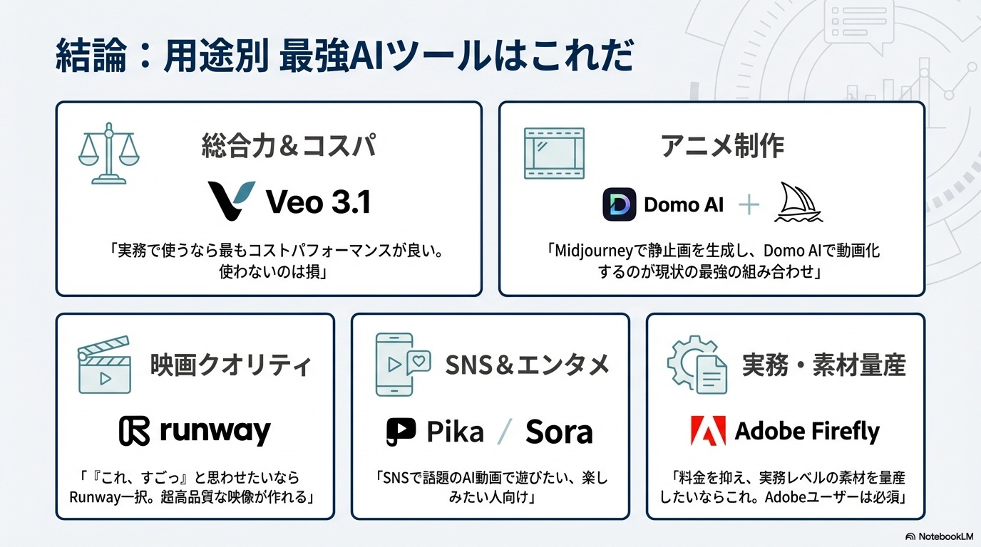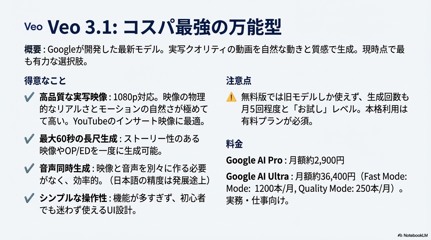 結論①:プロが選ぶ「コスパ最強」は派手なAIではなく、万能型の Veo 3.1