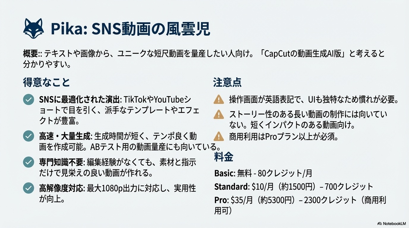 また、Pika は 「Pikaformance」 という音声駆動のフェイスアニメーション機能も搭載し、
