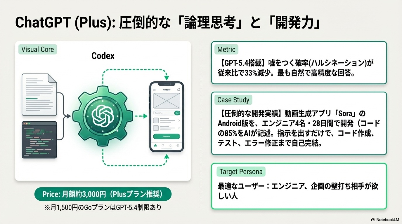 向いている人: AIと相談しながらアイデアを練りたい人(壁打ち)や、アプリ開発などのエンジニアリングに活用したい人