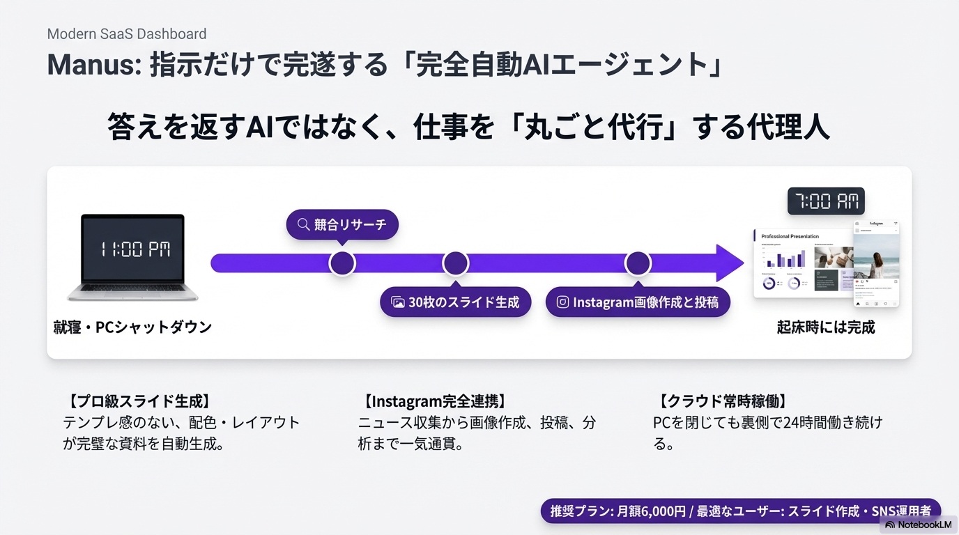 クラウド動作: 自分のパソコンを閉じている間(寝ている間など)も、裏側で作業を継続してくれます。