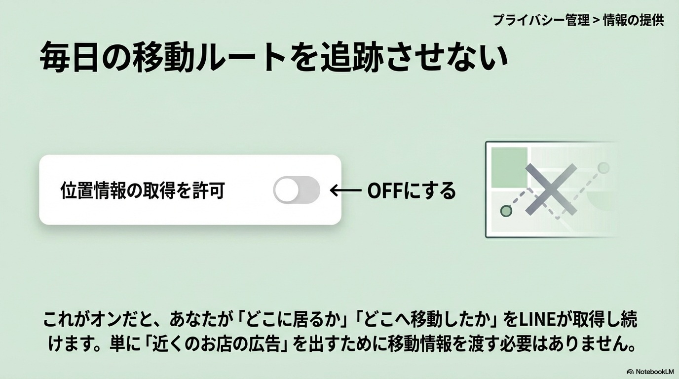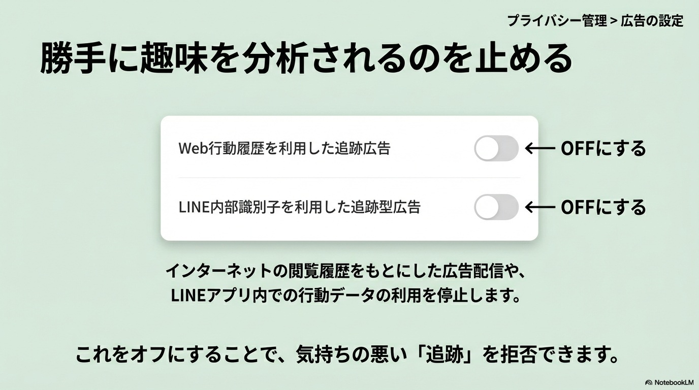 - LINE内部識別子を利用した追跡型広告の受信オフにする。