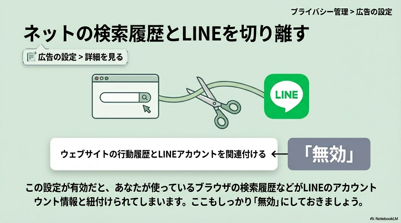 LINEおよびウェブサイトにおける閲覧・行動履歴は、ユーザーの興味関心を分析し、追跡型広告を配信するために利用されます。これにより、個人の趣味嗜好や関心事が意図せず収集されるリスクが生じます。