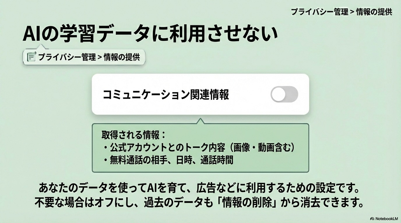「コミュニケーション関連情報」とは、LINEのサービス改善や広告配信、AI学習のために収集されるデータです。具体的には、企業等の公式アカウントとのやり取り(メッセージ内容、送受信した画像や動画など)や、無料通話のメタデータ(通話相手、日時、通話時間など)が含まれます。