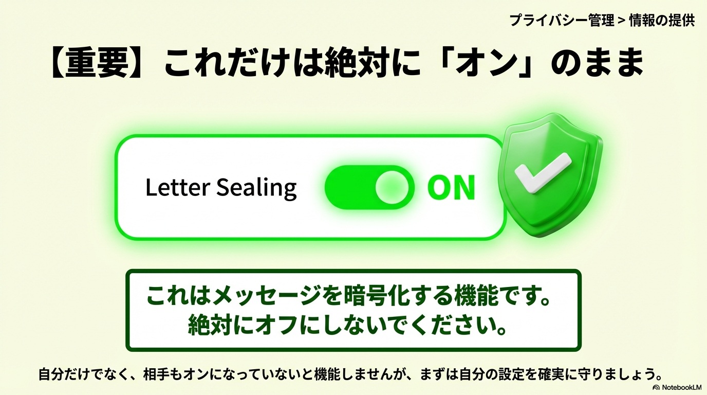 歯車マーク > プライバシー管理レターシーリングオンになっていることを必ず確認してください。ただし、この暗号化が有効に機能するためには、メッセージの送受信者双方が本設定を有効にしている必要がある点に留意してください。