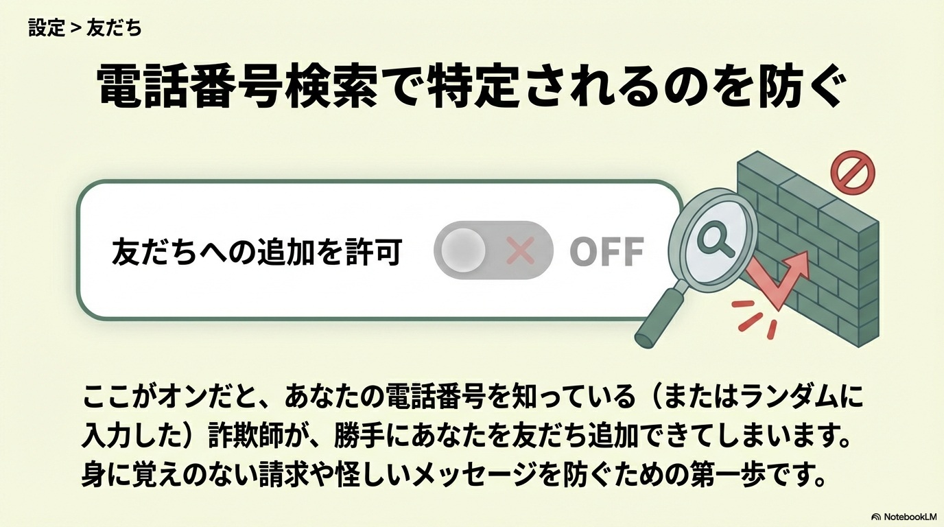 詐欺師たちは、電話番号を手がかりにしてLINEの中から個人情報を探し出すという手口で、積極的に詐欺の標的を探しています。心当たりのない相手から一方的に「友だち」に追加され、攻撃の起点とされることを防ぐため、以下の設定を必ず無効化してください。