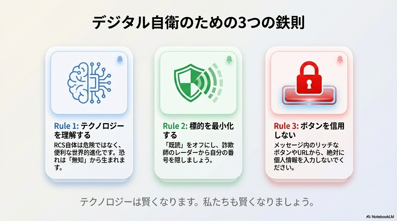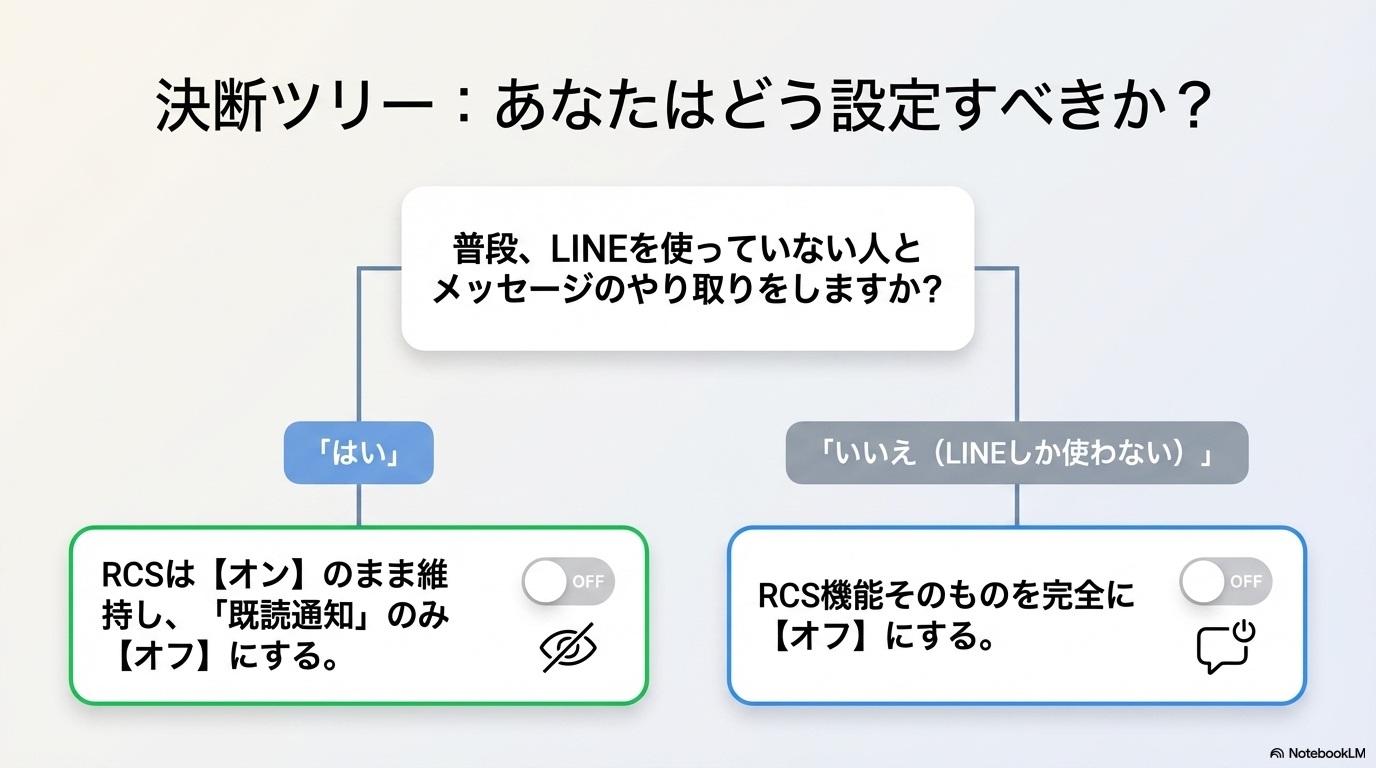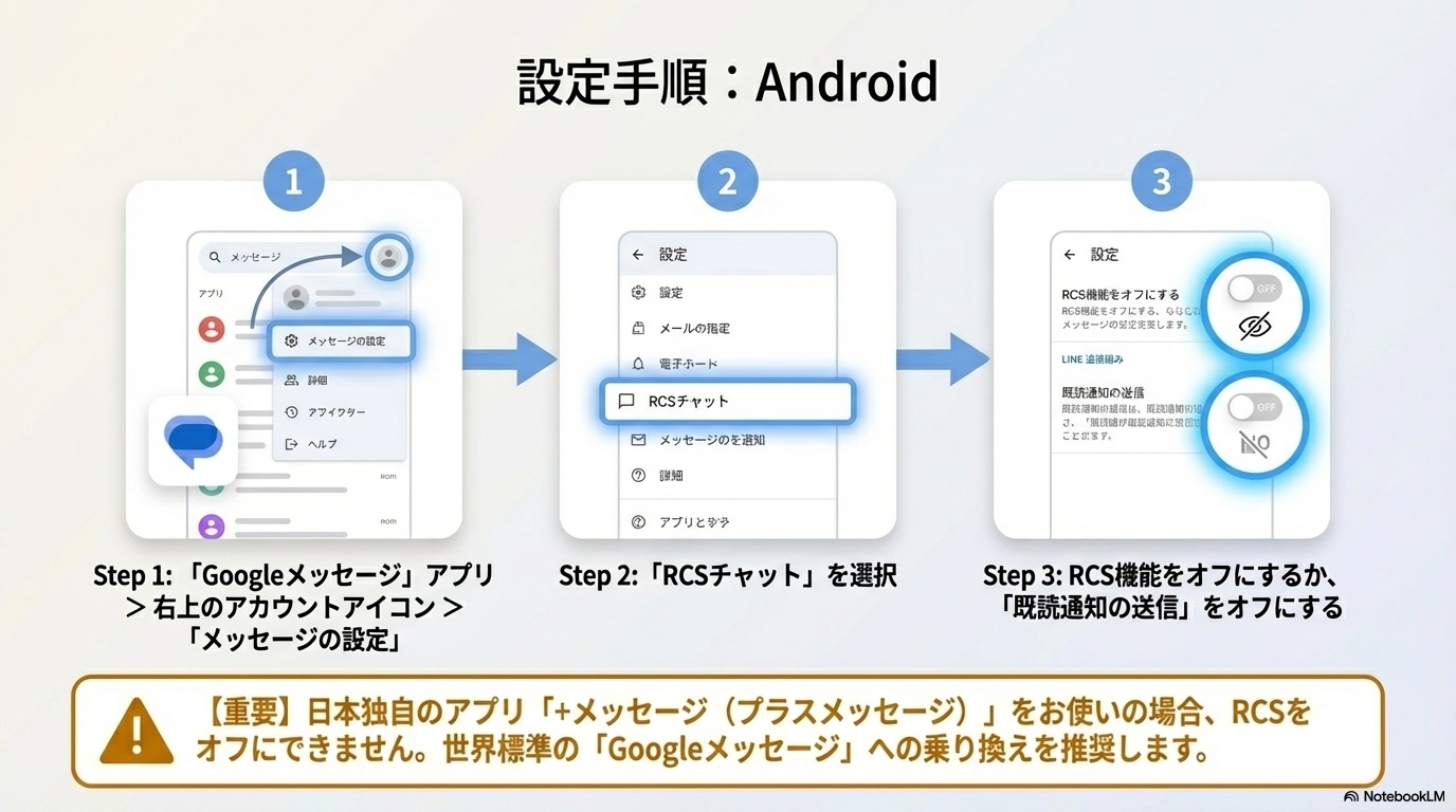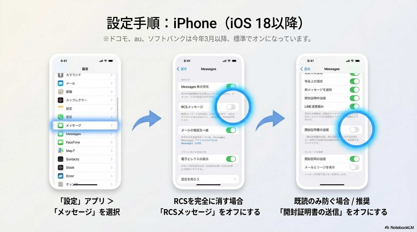 「既読通知」だけオフにする(推奨): RCSの機能は使いつつ、詐欺師に生存確認をさせないために、設定で「開封証明書(既読通知)の送信」をオフにすることが推奨されています。