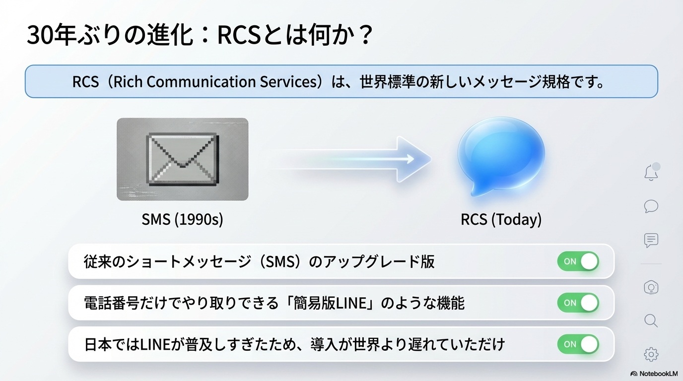 最近、多くのスマホに導入され始めた新機能「RCS(Rich Communication Services)」について、その正体とメリット、そして注意すべきリスクを詳しく分かりやすく解説します!