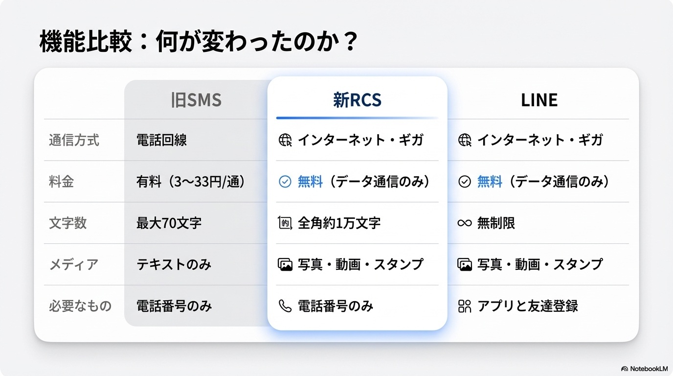 料金が無料(データ通信): SMSは1通ごとに料金(3円〜33円程度)がかかっていましたが、RCSはインターネット回線を利用するため、追加料金なしで利用できます(データ通信量は消費します)。