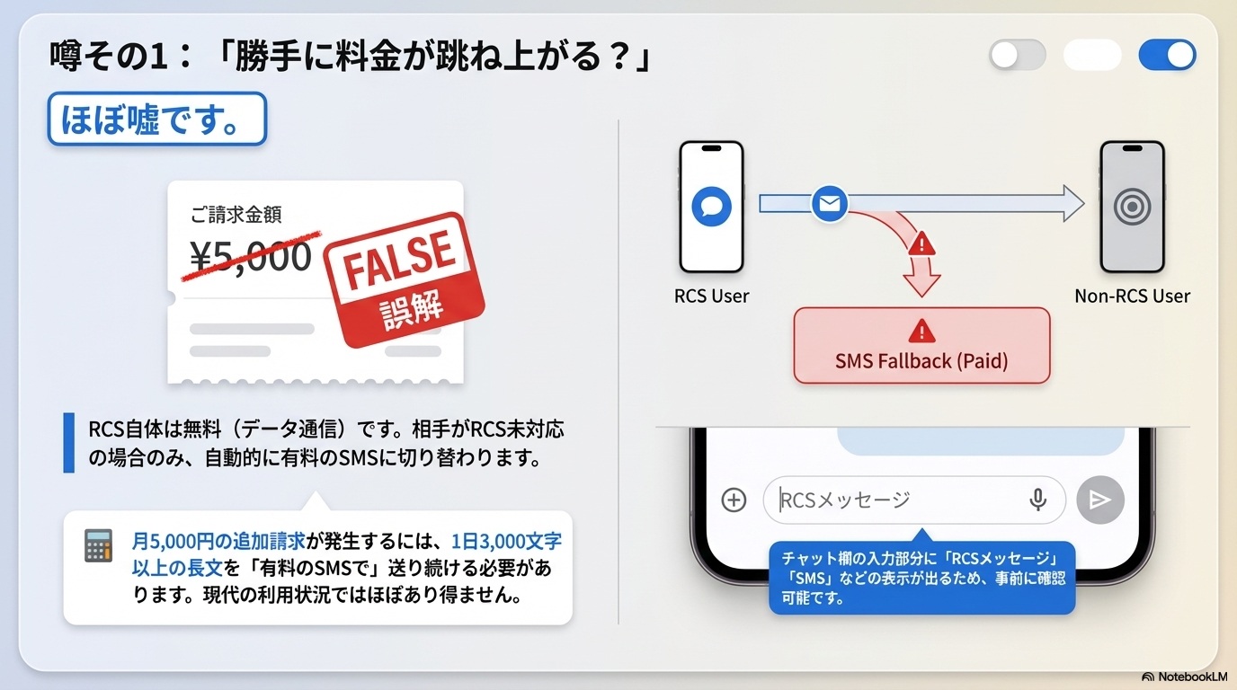 RCS同士のやり取りは無料ですが、相手がRCSに対応していない、あるいはオフにしている場合は、自動的に従来の有料SMSに切り替わります。そのため、無料だと思い込んで大量に送ると、SMSの送信料が加算されてしまうという注意点があります(ただし、数千円単位で跳ね上がることは稀です)。