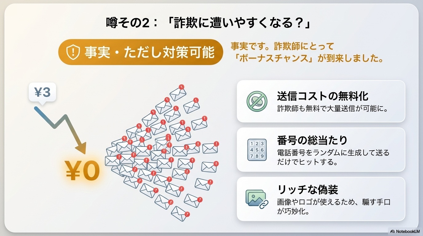 これが最大の懸念点です。詐欺師にとってもRCSは「都合の良いツール」になってしまいます。