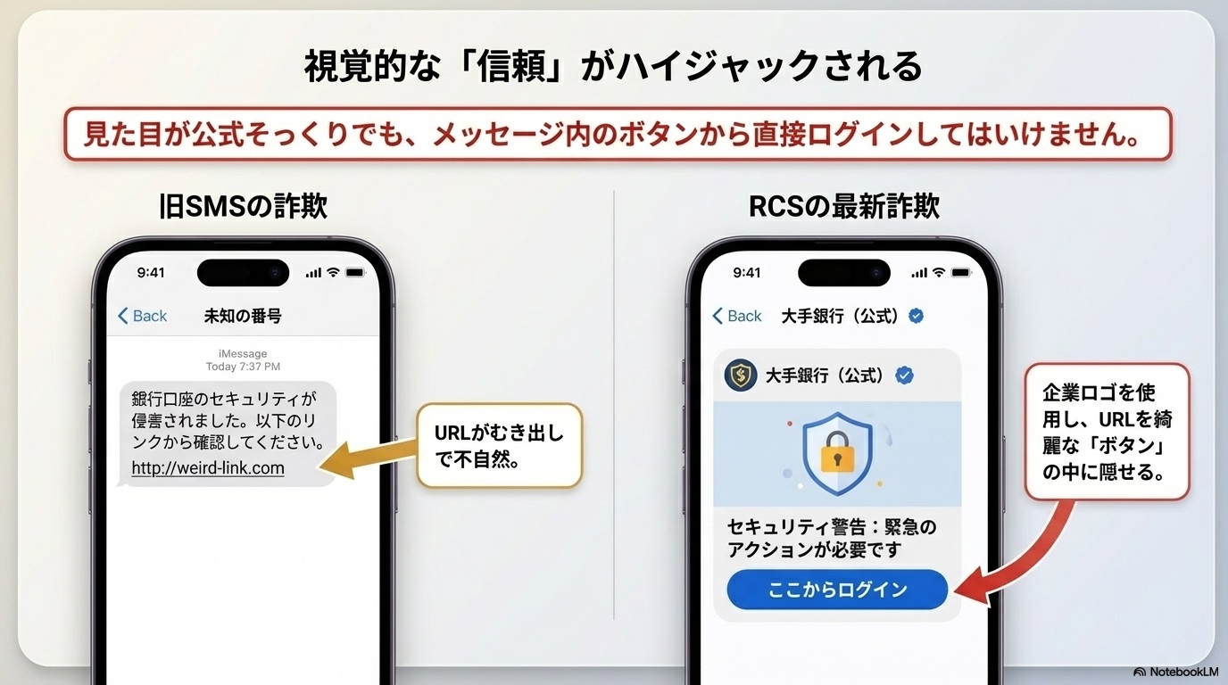 ・URLが隠される: 従来のSMSではURLが丸見えでしたが、RCSでは「ログイン」といったボタンの中にURLを仕込めるため、偽サイトへ誘導されやすくなります。