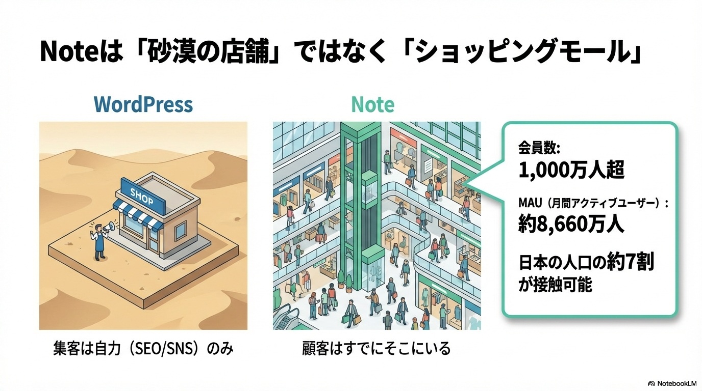 現代のネット空間は、砂漠のようなものです。そこにポツンとWordPressという店を建てても、誰も気づきません。一方で、noteというプラットフォームは、いまや月間アクティブユーザー数(MAU)8,660万人(2025年6月時点)、会員数1,000万人を突破する巨大な「人の集まる街」へと成長しました。