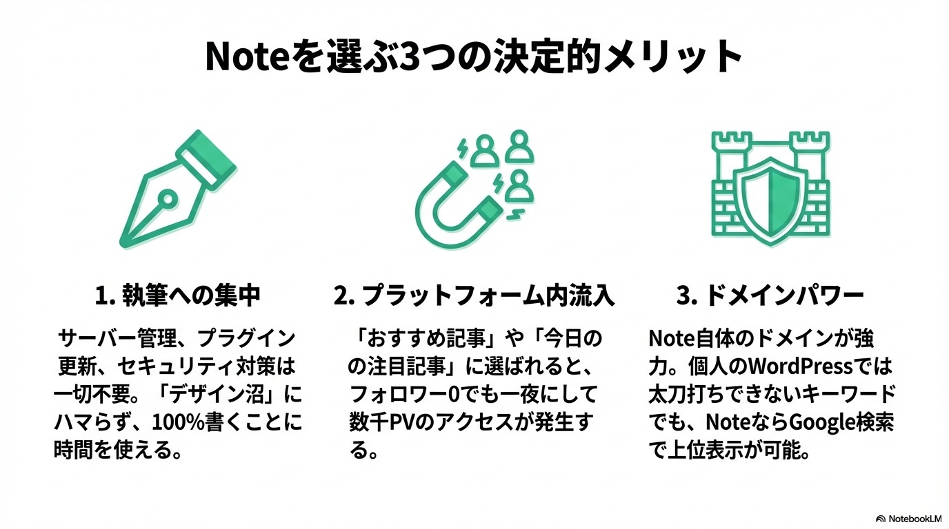 PVを追い求め、広告をクリックさせるために消耗するWordPressのモデルに対し、noteは「良質な人間としての発信」そのものに報酬が発生します。コンテンツがAIに飲み込まれる時代において、プラットフォームがクリエイターの権利を守る姿勢は、我々にとって大きな安心感となります。
