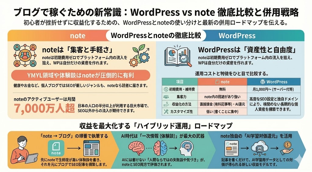 私はnoteとWordPressを「二者択一」で考える必要はないと考えています。むしろ、以下の手順で併用する「黄金ルート」こそが、AI時代の最強戦略です。